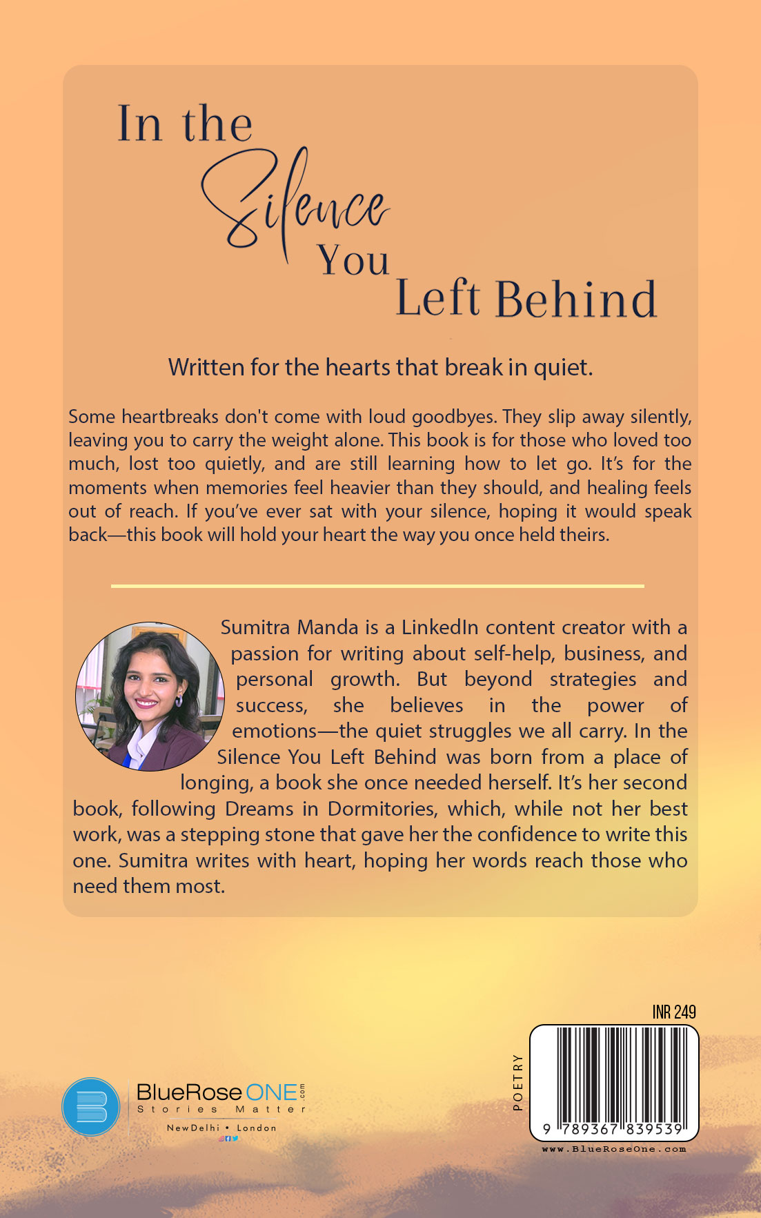 In the Silence You Left Behind is her second book, written from a place of longing, a book she once needed herself. Her first book, Dreams in Dormitories, was a stepping stone—imperfect yet essential in her journey as a writer. Sumitra writes with heart, hoping her words find those who need them most.